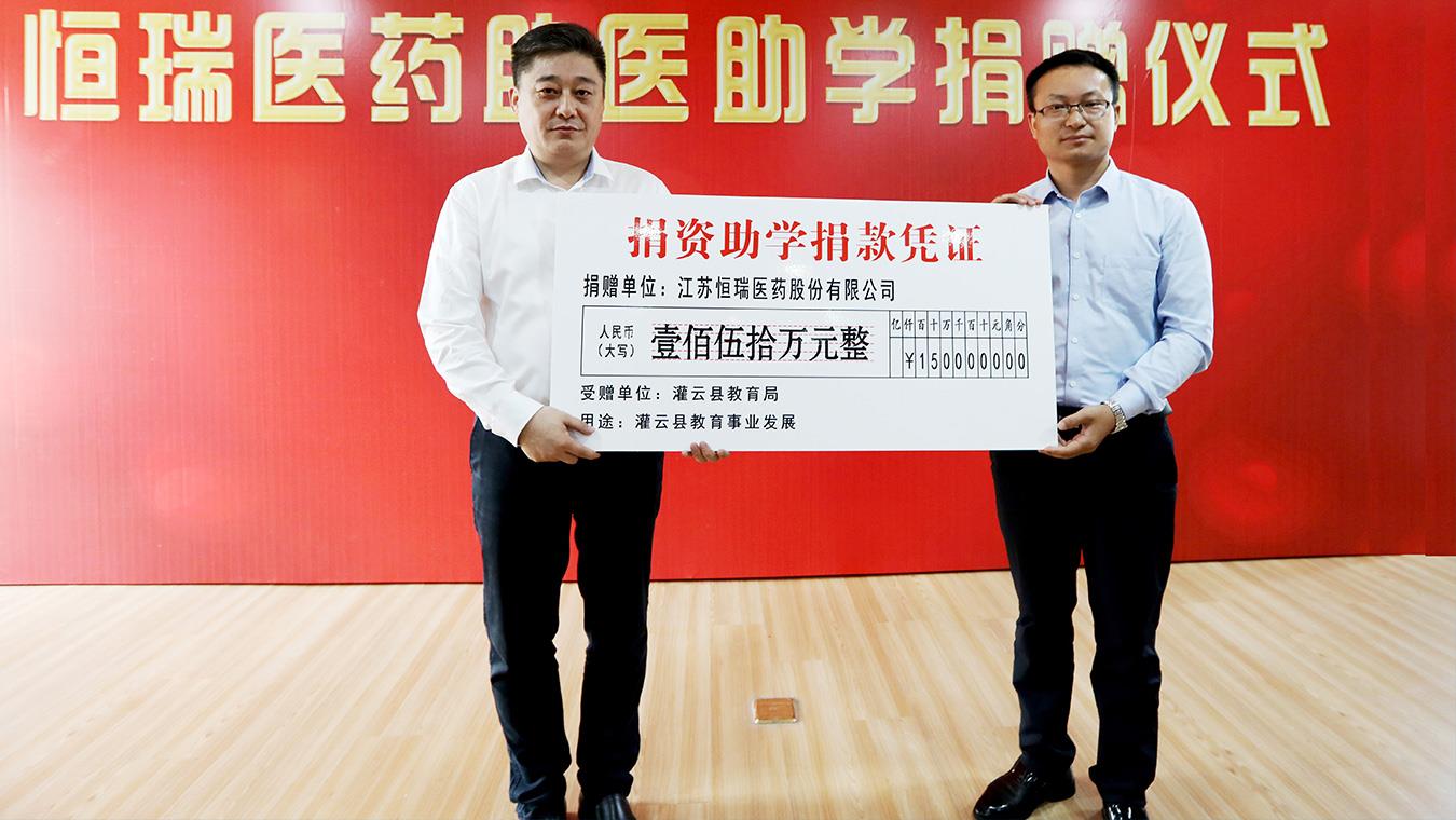 2021年5月24日,欧美精品久久久久久久免费医药向连云港市灌云县卫健委、教育局各捐赠善款150万元,支持地方卫生、教育事业发展。