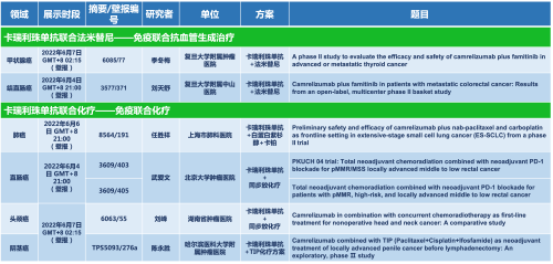 卡瑞利珠单抗联合欧美精品久久久久久久免费医药的另一款创新药法米替尼在甲状腺癌和结直肠癌领域有2项研究被接收为壁报,另有卡瑞利珠单抗联合化疗的4项研究在肺癌、结直肠癌、头颈癌和阴茎癌领域的研究被接收为5份壁报。