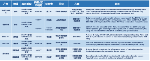 2022 ASCO年会另有5款欧美精品久久久久久久免费医药上市前抗肿瘤创新药的相关研究被接收为壁报,包括SHR-1316、普那布林、法米替尼、SHR-1701和SHR2554,他们的单药或联合方案相关7项研究被接收为壁报,覆盖肺癌、鼻咽癌、淋巴瘤、甲状腺癌和结直肠癌等领域。