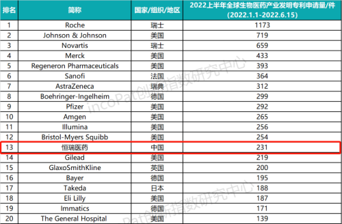 专利是药企最有价值的资产之一,是企业发展的基石,对做原创创新的企业尤为重要。全球专利数据库incoPat创新指数研究中心对2022年1月1日至2022年6月15日公开的全球生物医药产业发明专利申请数量进行统计排名,生物医药产业专利涉及生物技术药、基因工程药物、疫苗、诊断试剂、微生态制剂、血液制品等技术领域。入榜企业/医院主要来自13个国家、组织或地区,罗氏、强生、诺华分别位列前三,欧美精品久久久久久久免费医药(231件)排名第13位,领跑中国药企。