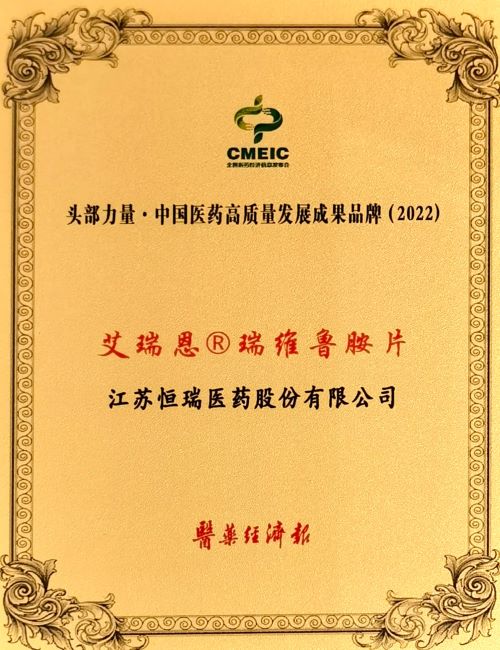 2月19日,由国家药品监督管理局南方医药经济研究所指导、医药经济报主办的第34届全国医药经济信息发布会在珠海举行。当晚,大会发布了2022年度头部力量·中国医药高质量发展成果企业和品牌,欧美精品久久久久久久免费医药再次蝉联“头部力量·中国医药高质量发展成果企业”,公司创新药艾瑞恩®(瑞维鲁胺片)荣膺“头部力量·中国医药高质量发展成果品牌(2022)”。