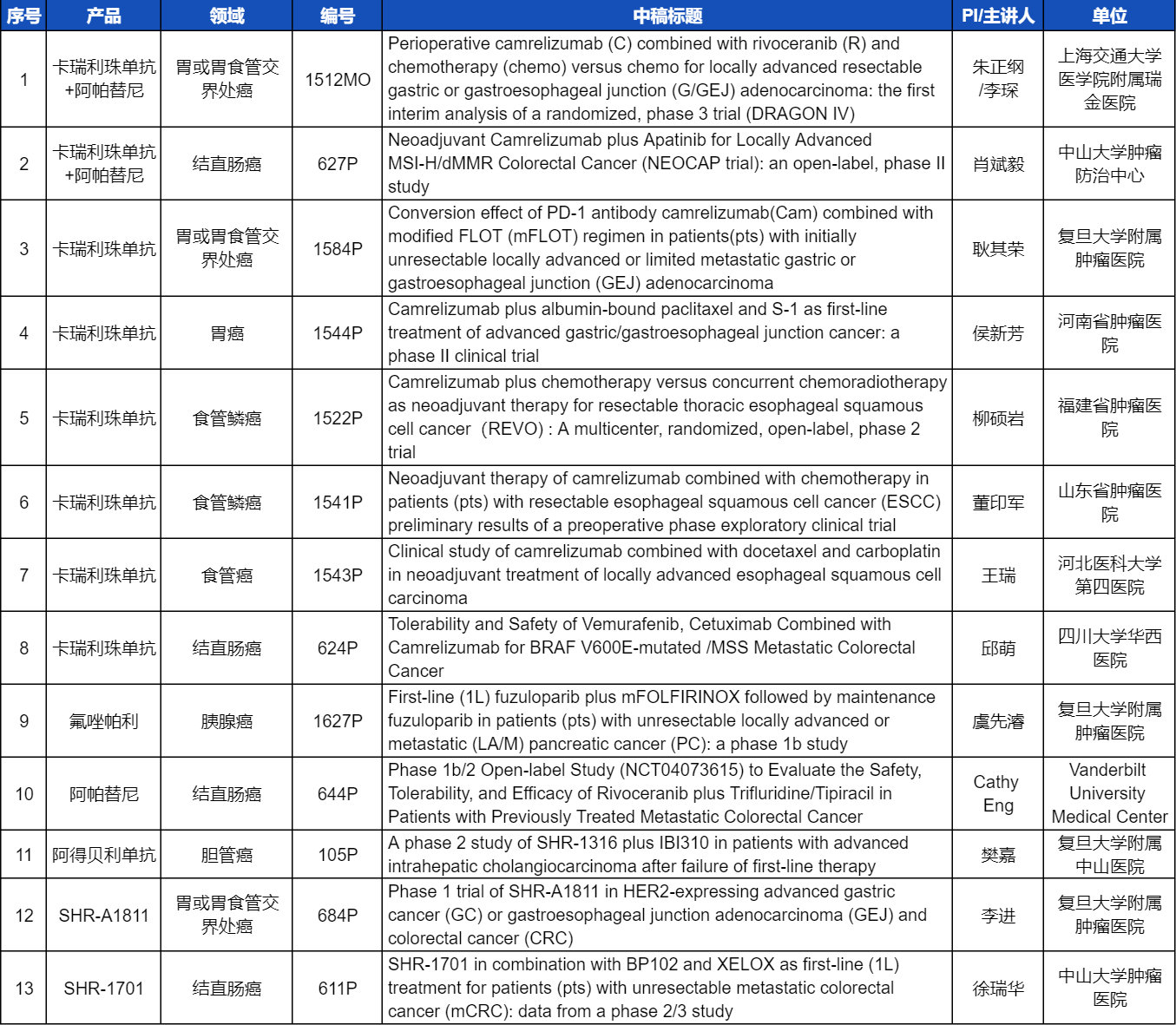 本次ESMO大会,将由中山大学肿瘤医院徐瑞华教授、广东省人民医院周清教授、中山大学孙逸仙纪念医院姚和瑞教授、上海交通大学医学院附属瑞金医院李琛教授分别就4项欧美精品久久久久久久免费医药创新产品相关研究做口头报告,包括SHR-1701、SHR-A2009、SHR-A1811这3款未上市创新产品的实体瘤治疗临床研究,以及1项“双艾”组合(卡瑞利珠单抗联合阿帕替尼)治疗局部晚期可切除胃/胃食管交界处癌的Ⅲ期临床试验期中分析。
