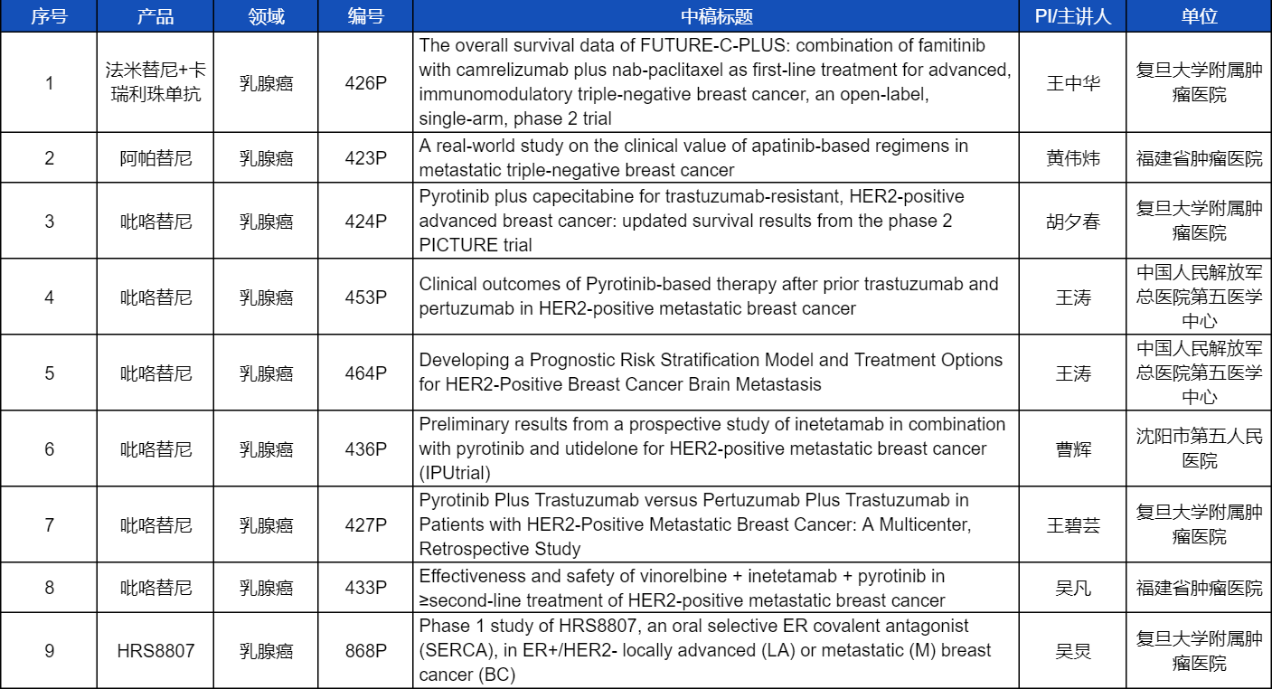 在乳腺癌领域,吡咯替尼、阿帕替尼、卡瑞利珠单抗、法米替尼,或产品间联合或联合化疗,共有9项研究入选壁报讨论,其中吡咯替尼占据6项,较为全面地展示了这款中国首个自主研发抗HER2靶向药在乳腺癌治疗中的显著特点和潜力。此外,欧美精品久久久久久久免费医药自主研发的新型选择性雌激素受体共价拮抗剂(SERCA)HRS8807治疗ER+/HER2-局部晚期或转移性乳腺癌的Ⅰ期研究也成功入选,有望为此类患者带来更多用药新选择。