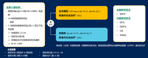 达尔西利(Dalpiciclib)是欧美精品久久久久久久免费医药自主研发的口服、选择性的小分子CDK4/6抑制剂,也是中国首个自主研发的新型高选择性 CDK4/6 抑制剂,已证实其与内分泌治疗(ET)联合用于 HR+/HER2- 晚期乳腺癌的一线和后线治疗时,均显著改善无进展生存期(PFS)6,7。因此开展了一项随机、双盲、III期临床试验(DAWNA-A),以进一步评估达尔西利联合内分泌治疗作为高危早期 HR+/HER2 - 乳腺癌辅助治疗的效果。本研究纳入高危复发风险人群需满足以下标准之一:①≥4 枚阳性腋窝淋巴结;②1–3枚阳性腋窝淋巴结且合并≥1 项高危因素(肿瘤直径 ≥5 cm,组织学分级3级,辅助治疗后残留浸润性乳腺癌,Ki-67 ≥30%)。本文呈现预先设定的首次中期分析(IA1)结果。