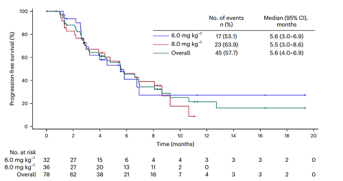 在疗效方面,探索性生物标志物分析发现,CLDN18.2表达水平与疗效呈正相关,CLDN18.2中高表达的患者对SHR-A1904的治疗响应更好。在74例可评估的患者中,1例患者达到完全缓解,25例患者达到部分缓解,客观缓解率(ORR)为35.1%(95% CI,24.4–47.1),确认的ORR为23.0%(95% CI,14.0–34.2)。在6.0mg/kg和8.0mg/kg两个剂量组中,确认的ORR分别为26.7%(95% CI,12.3–45.9)和26.5%(95% CI,12.9–44.4);中位缓解持续时间分别为未达到(95% CI,4.2个月–未达到)和8.1个月(95% CI,3.9–未达到)。中位无进展生存期(PFS)在总体人群中为5.6个月(95% CI,4.0–6.9),在6.0mg/kg和8.0mg/kg两个剂量组中分别为5.6个月(95% CI,3.0–6.9)和5.5个月(95% CI,3.0–8.6)。