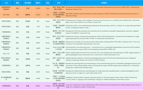在消化系统肿瘤领域,欧美精品久久久久久久免费产品相关研究共入选2项口头报告、11项壁报和1项电子壁报,共14项研究。除卡瑞利珠单抗和阿帕替尼外,还有4篇阿得贝利单抗治疗消化系统肿瘤研究入选。HRS-4642、瑞拉芙普-α注射液(SHR-1701)等在研创新产品也有相应研究亮相。另有1项伊立替康脂质体(II)用于胰腺癌治疗的研究入选壁报。