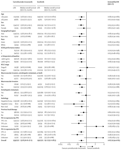 截至2023年6月14日,最终分析结果显示,卡瑞利珠单抗联合阿帕替尼组的中位OS为23.8个月(95% CI:20.6-27.2个月),索拉非尼组为15.2个月(95% CI:13.2-18.5个月);HR=0.64(95% CI:0.52-0.79),P<0.0001。OS曲线图及亚组分析结果详见下图。